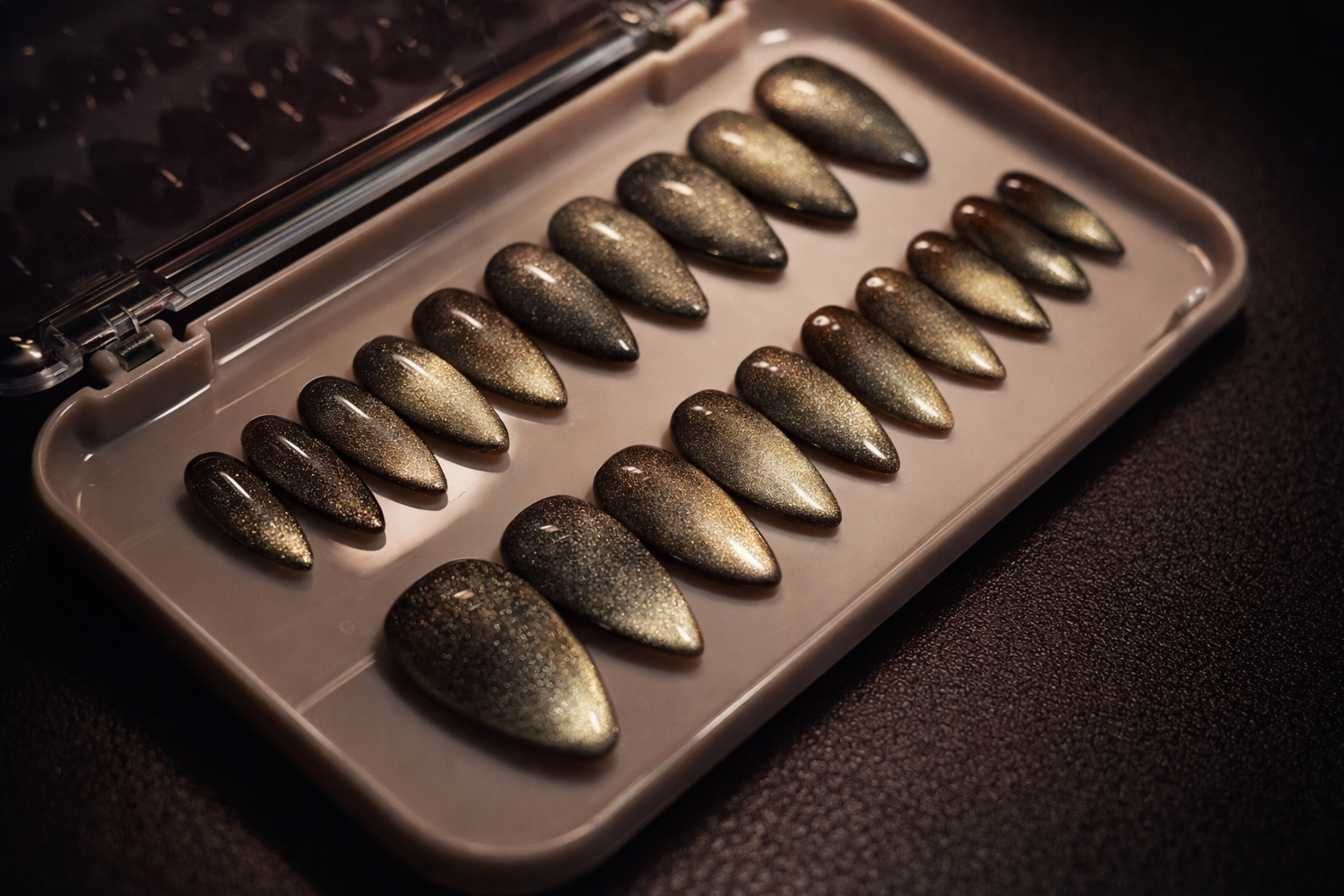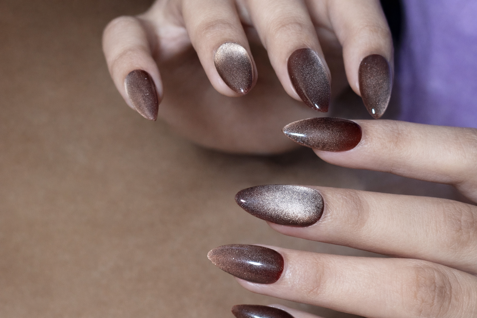 Ambar is a deep golden-brown cat-eye set that glows like liquid metal under soft light. Each nail carries a warm, molten gold sheen that shifts with every movement, giving a rich, textured depth reminiscent of sunlit amber stones and burnished metal.