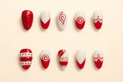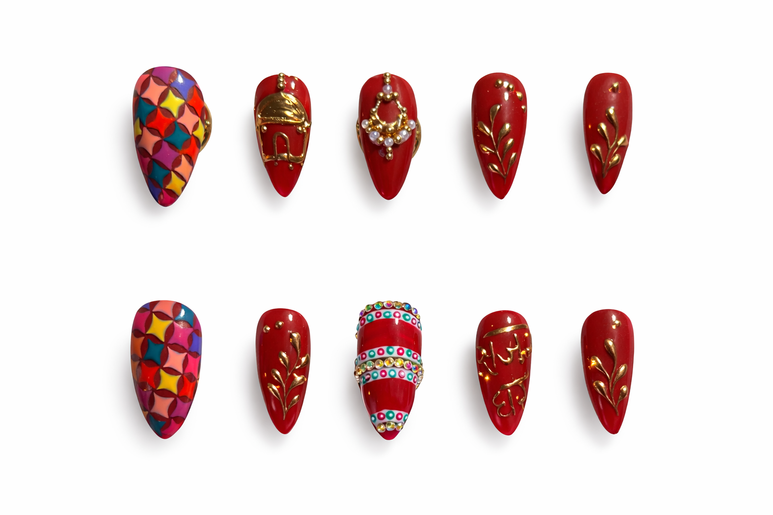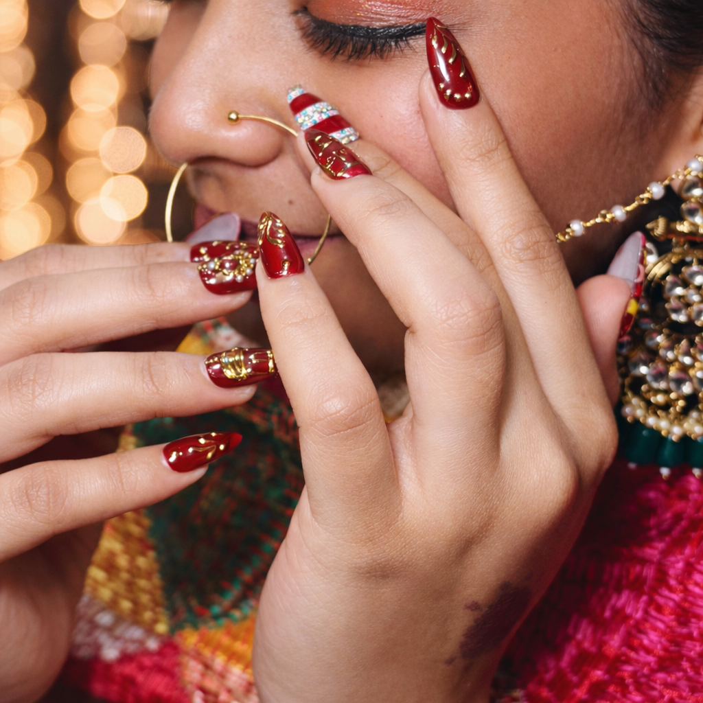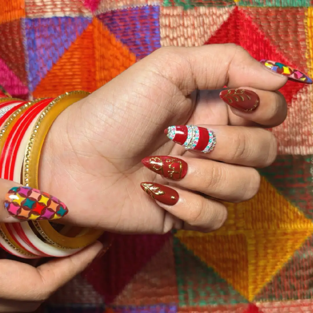 This Punjabi bridal nail set captures the vibrancy and exuberance of Punjabi wedding culture through bold colours, rich reds, and celebratory detailing. Deep crimson and maroon bases symbolise love, strength, and marital joy, while ornate gold leaf and motif accents echo traditional Punjabi jewellery and Phulkari embroidery. Multicoloured geometric patterns draw inspiration from lively Punjabi textiles, representing festivity, abundance, and happiness. Crystal and enamel band detailing adds a celebratory sparkle reminiscent of bridal Chooda bangles and wedding adornments. Together, these elements create a spirited, high-energy bridal expression that reflects Punjabi warmth, tradition, and unapologetic celebration.