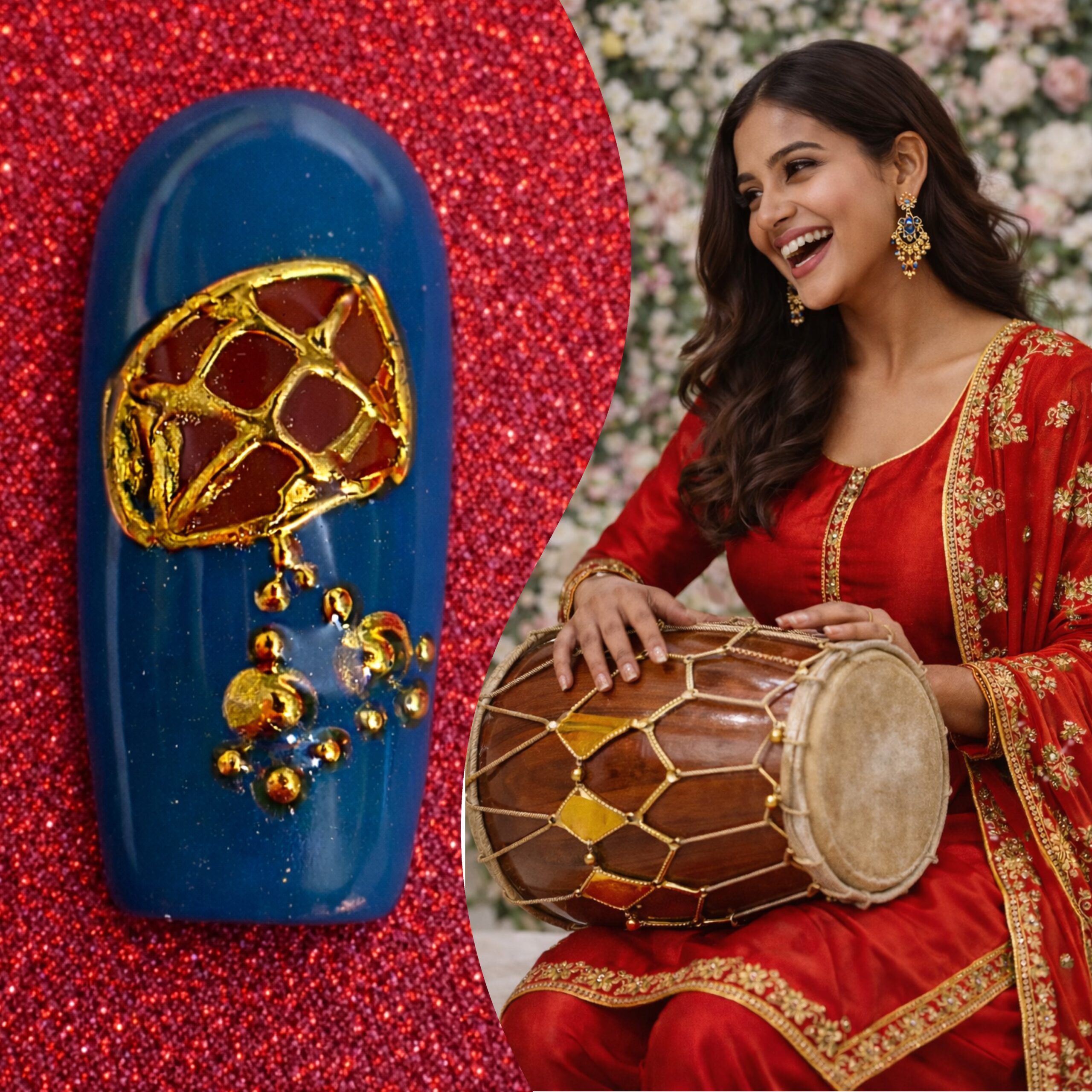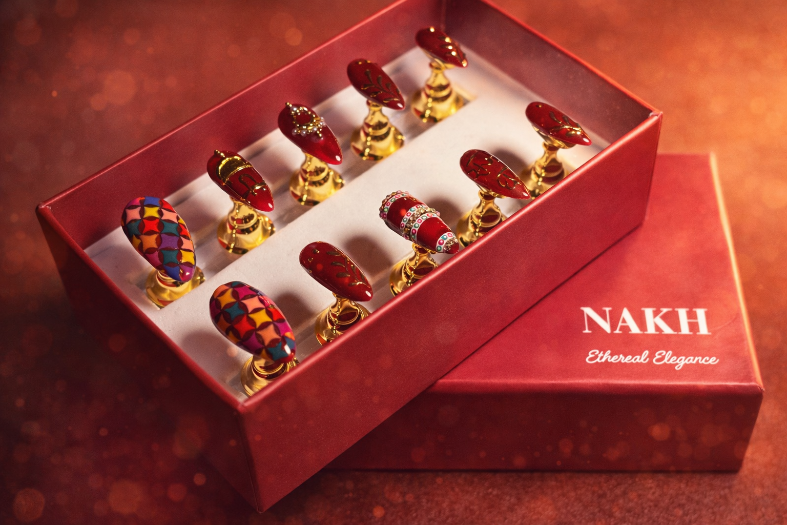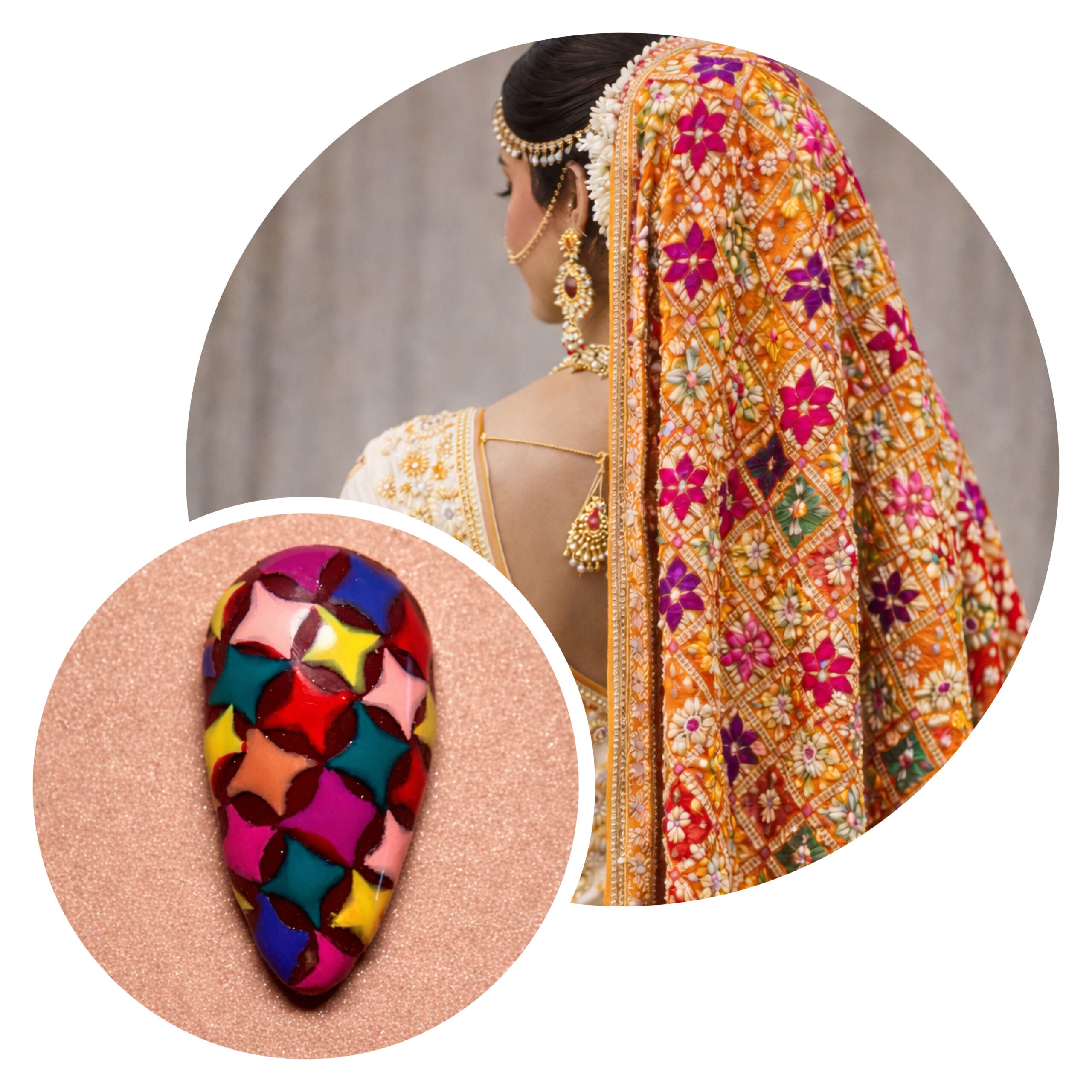 This Punjabi bridal nail set captures the vibrancy and exuberance of Punjabi wedding culture through bold colours, rich reds, and celebratory detailing. Deep crimson and maroon bases symbolise love, strength, and marital joy, while ornate gold leaf and motif accents echo traditional Punjabi jewellery and Phulkari embroidery. Multicoloured geometric patterns draw inspiration from lively Punjabi textiles, representing festivity, abundance, and happiness. Crystal and enamel band detailing adds a celebratory sparkle reminiscent of bridal Chooda bangles and wedding adornments. Together, these elements create a spirited, high-energy bridal expression that reflects Punjabi warmth, tradition, and unapologetic celebration.