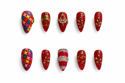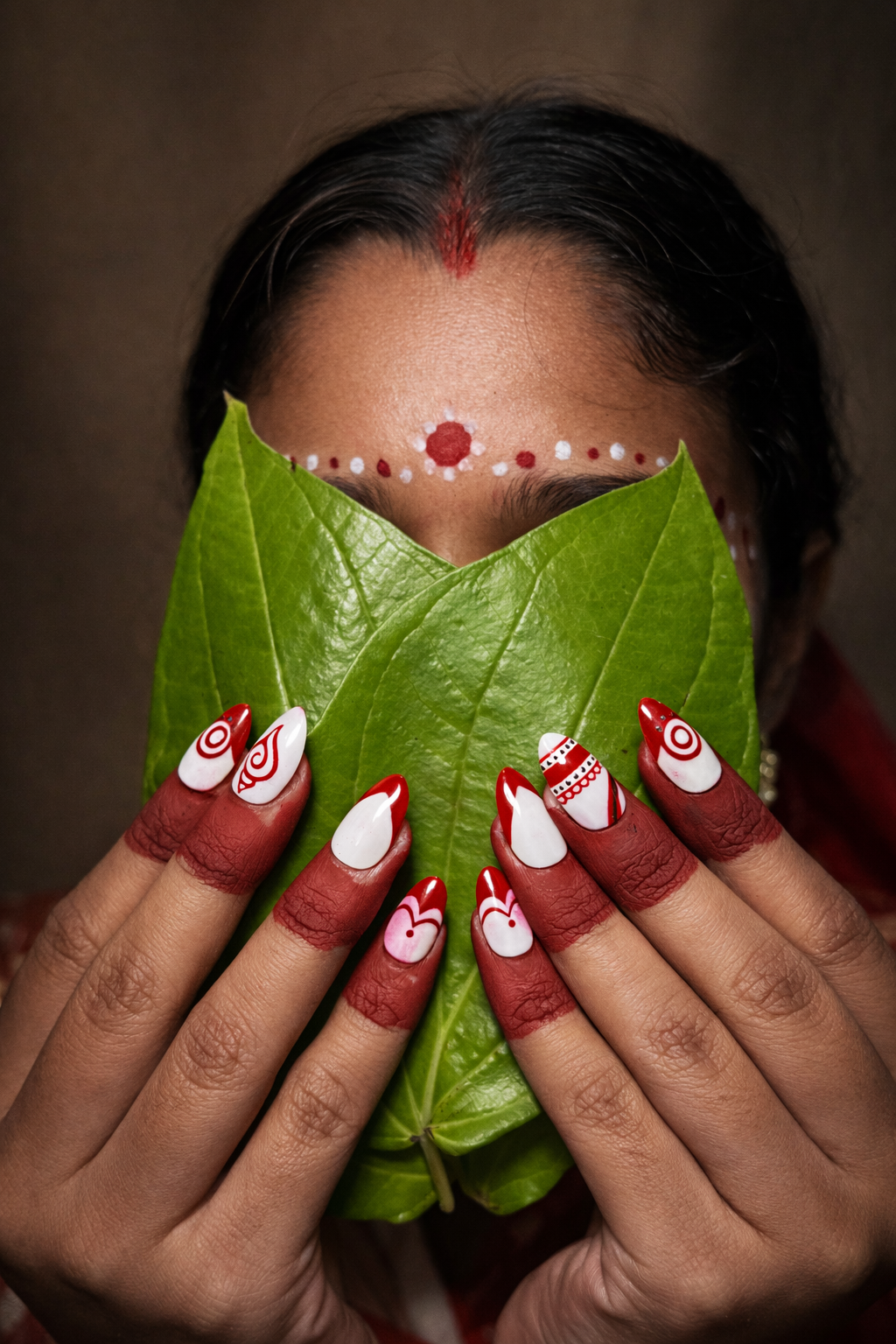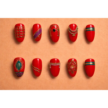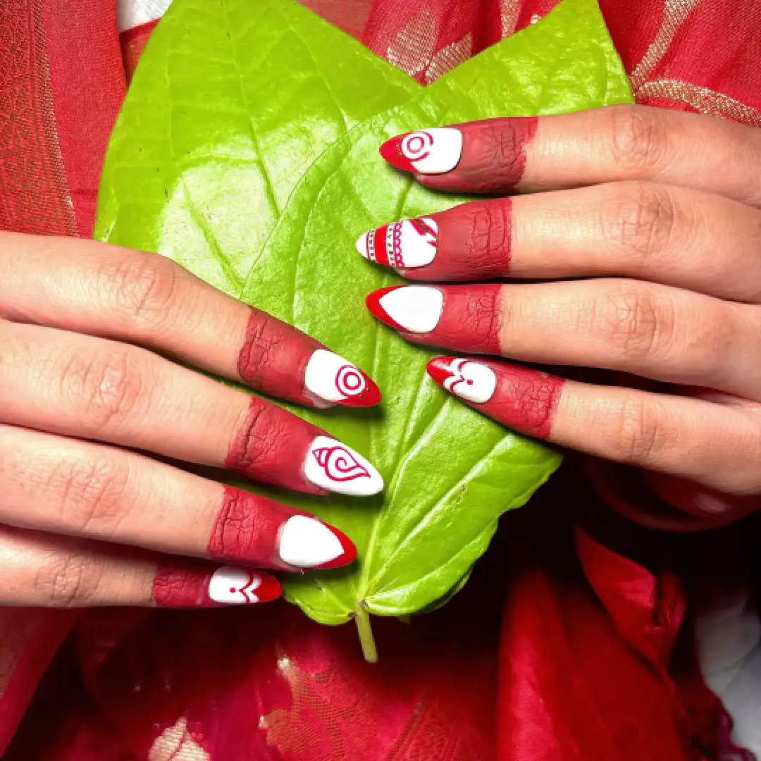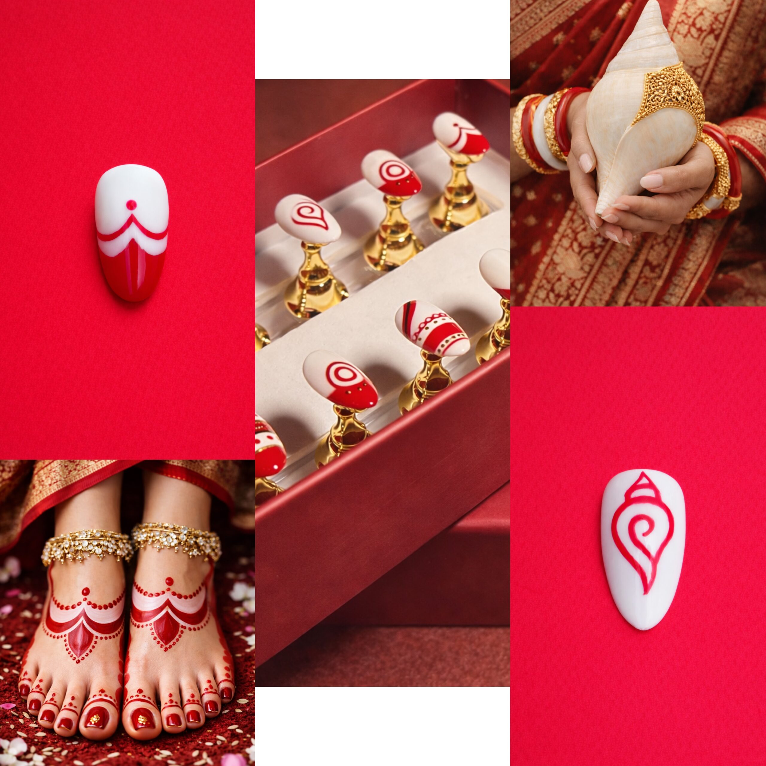 This Bengali bridal nail set is inspired by the sacred rituals of a traditional Bengali wedding, centred around the symbolism of alta, shankha–pola, and auspicious red-white contrasts with facial structure of Durga Maa depicting courage and resilience. The deep alta-red finger detailing reflects marital sanctity and feminine power, while the crisp white nail base represents purity and new beginnings. Intricate red motifs drawn in flowing, conch-inspired curves echo shankha bangles and sacred markings used in bridal ceremonies, symbolising prosperity and protection. Minimal dotted accents add a ritualistic rhythm, mirroring traditional alpana art. Together, these elements create a bold yet sacred bridal expression that honours Bengali heritage, devotion, and timeless ceremonial elegance.