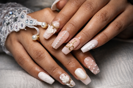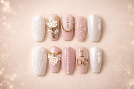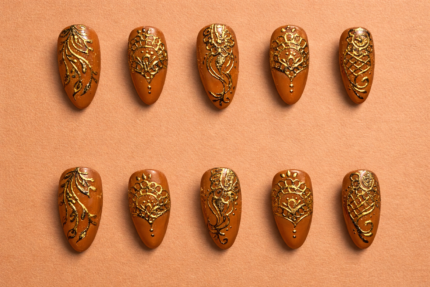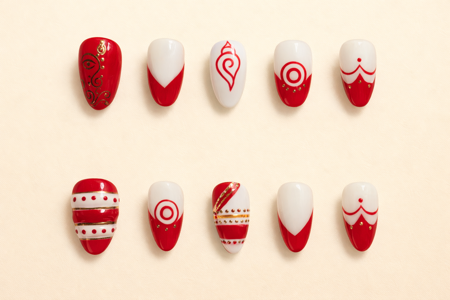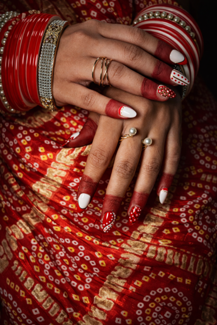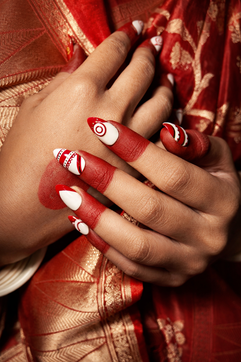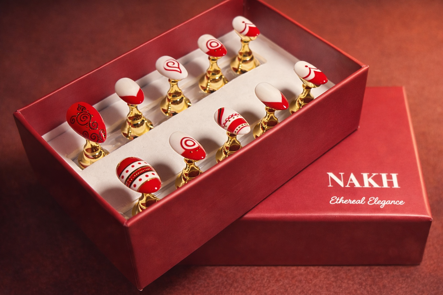 This Bengali bridal nail set is inspired by the sacred rituals of a traditional Bengali wedding, centred around the symbolism of alta, shankha–pola, and auspicious red-white contrasts with facial structure of Durga Maa depicting courage and resilience. The deep alta-red finger detailing reflects marital sanctity and feminine power, while the crisp white nail base represents purity and new beginnings. Intricate red motifs drawn in flowing, conch-inspired curves echo shankha bangles and sacred markings used in bridal ceremonies, symbolising prosperity and protection. Minimal dotted accents add a ritualistic rhythm, mirroring traditional alpana art. Together, these elements create a bold yet sacred bridal expression that honours Bengali heritage, devotion, and timeless ceremonial elegance.