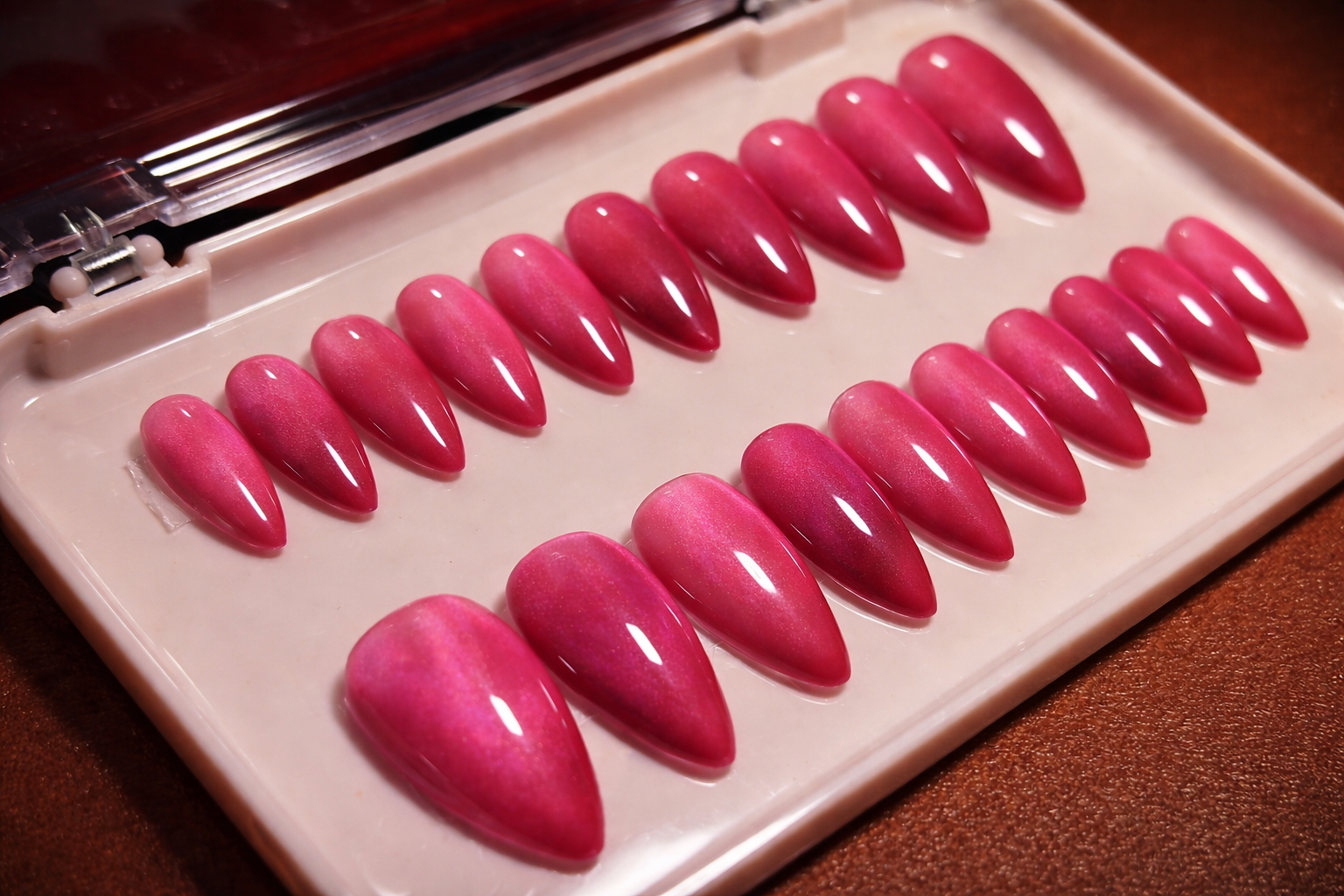 Gulaal embodies the joy and colour of Indian festivals. This cat-eye set glows with layered pink tones — from soft rose to vibrant fuchsia — creating a luminous, shifting effect reminiscent of powdered gulaal catching the light in mid-air.
