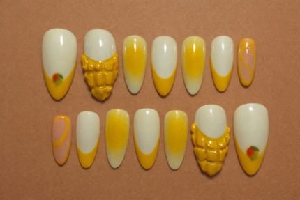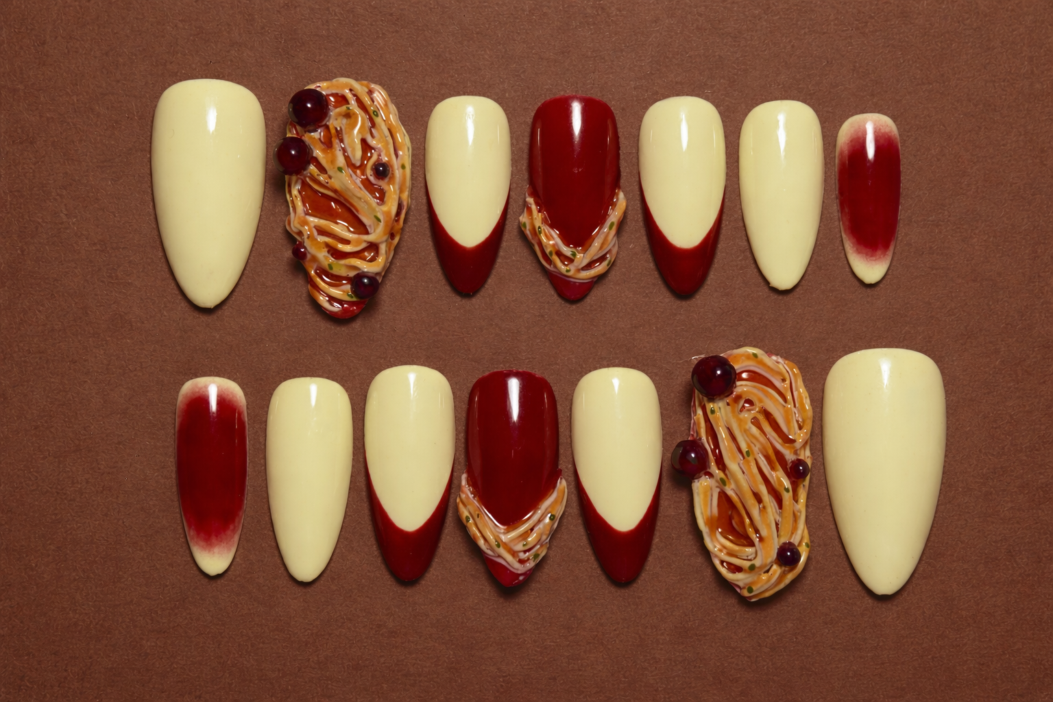 This spaghetti and meatballs–inspired nail set transforms comfort food into playful, high-fashion nail art. Rich tomato-red and creamy ivory bases echo classic Italian flavours, while sculpted noodle textures layered with sauce-like swirls create a striking 3D effect. Glossy bead accents resemble juicy meatballs and garnishes, adding depth and whimsy to the design. Clean, colour-blocked nails balance the bold food artistry, ensuring the look remains chic and wearable. Together, the collection celebrates indulgence, creativity, and culinary nostalgia with a bold, statement-making twist.