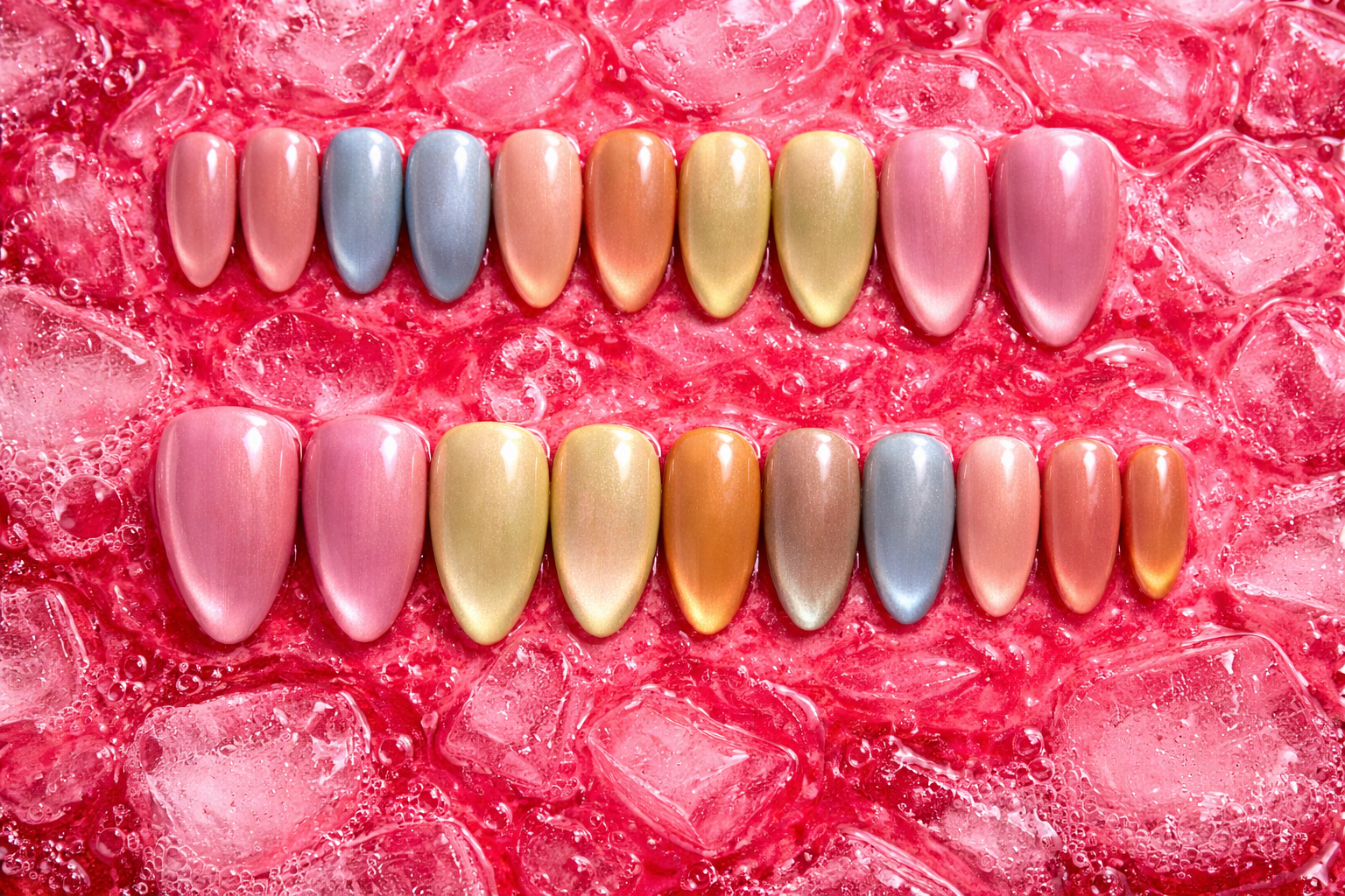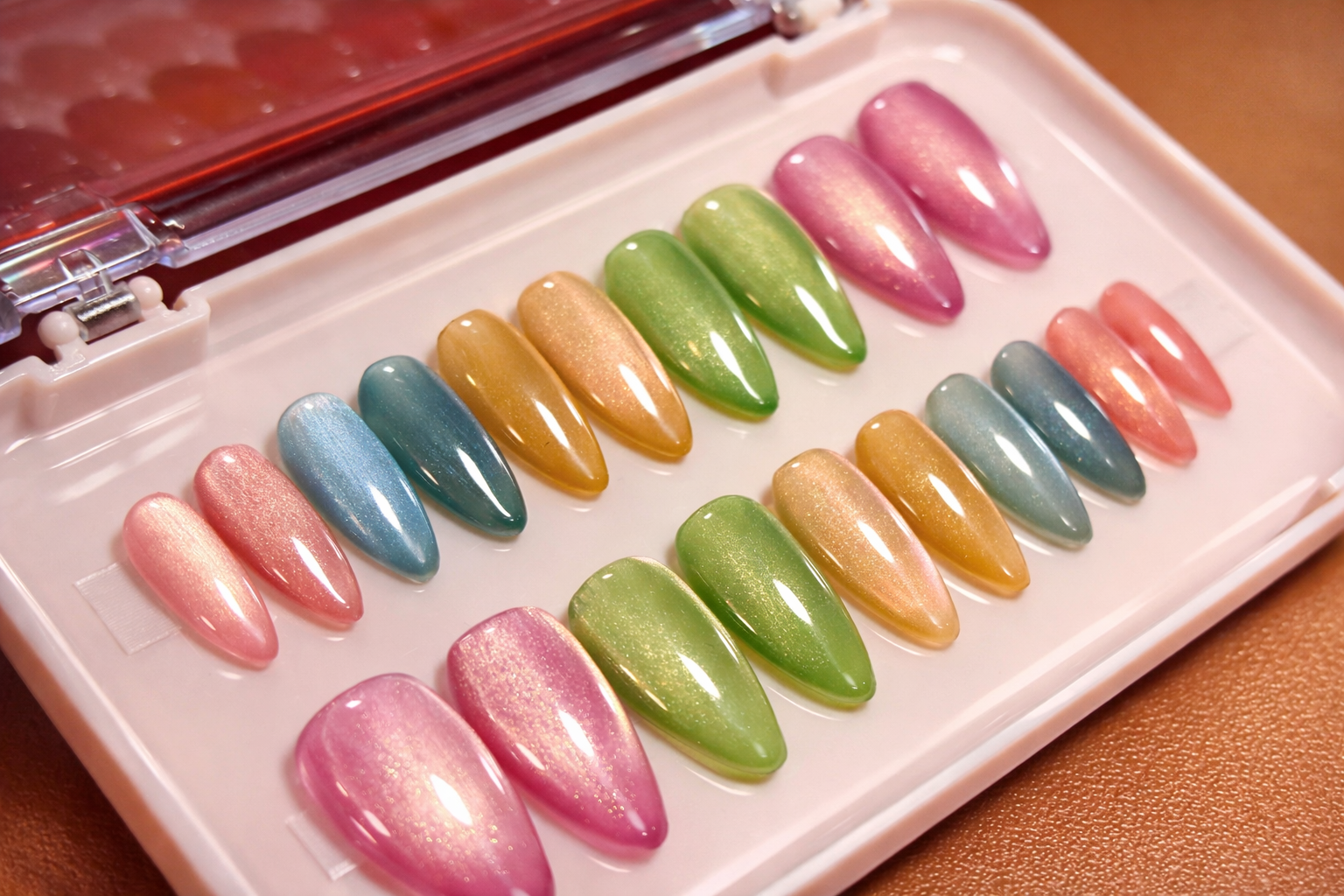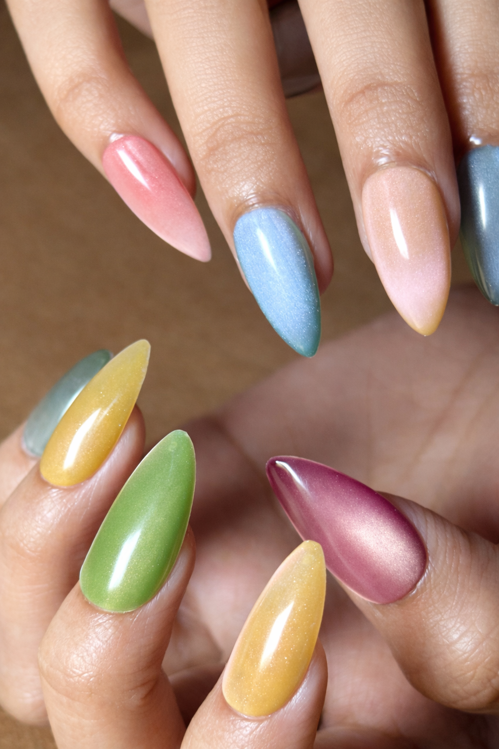 Sharbat is a pastel cat-eye collection inspired by the soothing colors of chilled summer drinks — rose, pista, kewda, mango, blueberry, and tender coconut. Each nail glows with a gentle, dewy sheen that moves under the light, giving a soft-focus, dreamy finish.